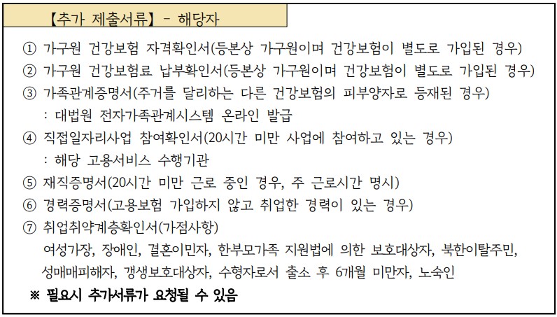 접수 시 제출서류는 JPG, JPEG, PNG, PDF, ZIP파일형식으로 용량이 최대 30M 이하여야 합니다. 또한 발급서류는 23.3.1. 이후에 발급된 서류만 첨부해야 합니다. 마이데이터연계 동의 시 등본, 초본, 건강보험자격확인서는 제출하지 않아도 됩니다.