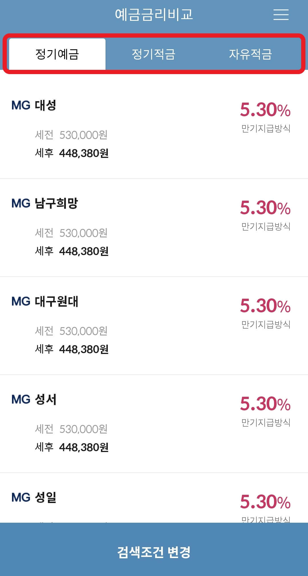 예금금리 비교 마이뱅크에서는 새마을금고와 신협의 금리 정보까지 제공하고 있어 우리의 시간을 절약해 주는 효율적인 금리비교 사이트 입니다. 또한 정기예금 정보 뿐만아니라, 정기적금, 자유적금 금리까지 한번에 확인 할 수 있다는 장점도 있습니다.
