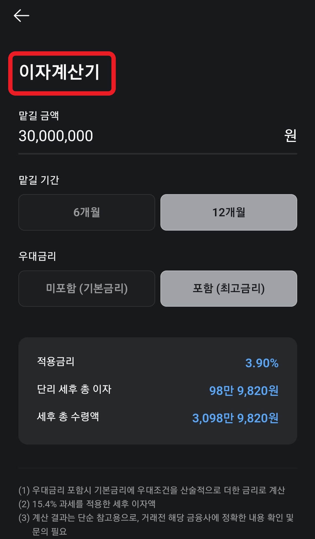 예금금리 비교 카카오페이 앱에서는 일반시중은행과 저축은행의 예금, 적금 상품의 금리비교를 할 수 있습니다. 가장 큰 장점은 내가 가입을 원하는 은행의 사이트로 바로 이동하는 기능이 있다는 점입니다. 또한 앱내에 이자계산기가 탑재되어 있어 내가 원하는 금액으로 이자를 자유롭게 계산해 볼 수 있습니다.