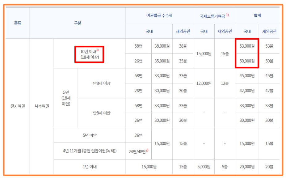 여권 갱신 준비물 여권 수수료는 여권의 면수와 연령에 따라 차이가 납니다. 가장 많은 사람들이 발급하는 18세 이상 10년 58면의 여권 수수료는 5,3000원입니다. 여행을 자주 다니는 분이 아니라면 26면의 50,000원 여권을 신청하시는 것도 괜찮습니다. 만 8세 이상 5년 58면 45,000원, 만 8세 미만 58면 33,000원입니다.